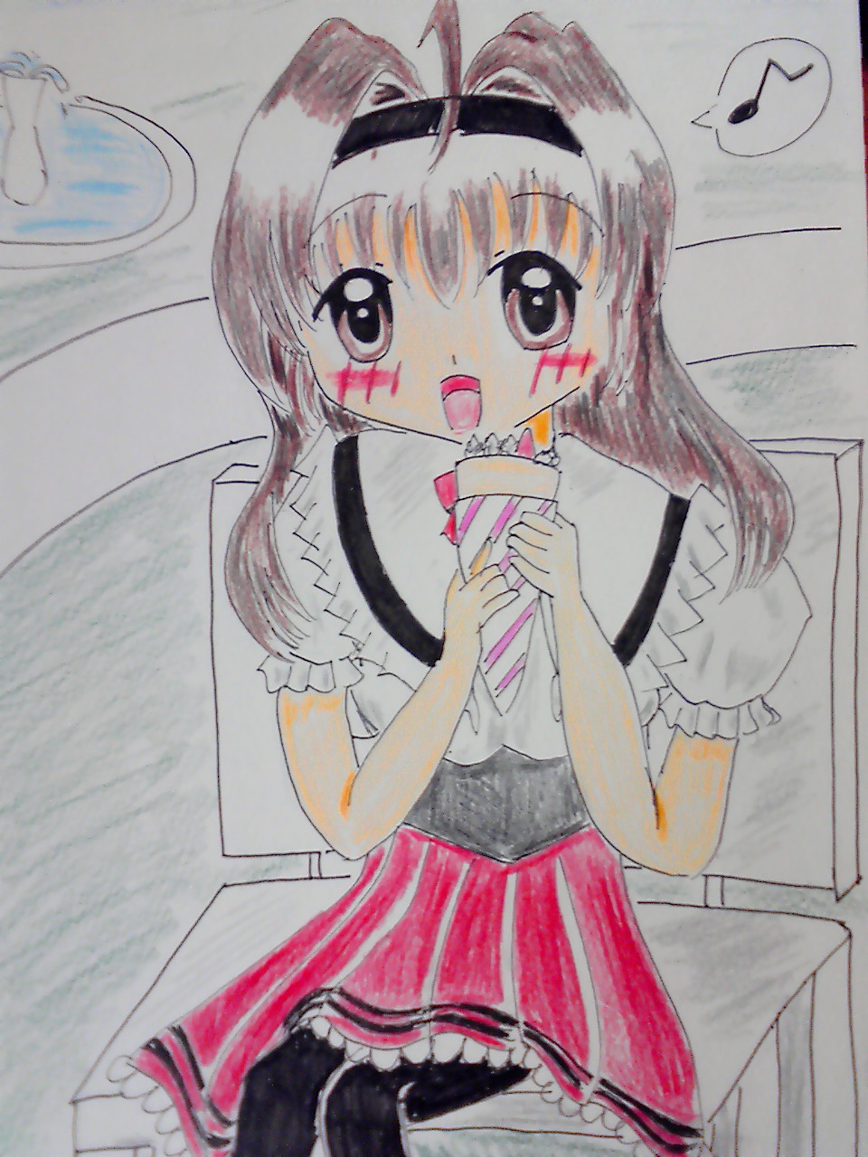 この絵を描いたのも、クレープを持ってる女の子って、なんかかわいいなあ…。と思って、こういう絵を描きました。もちろん、しーちゃんと私のデートという脳内の設定で描きました。ベンチで座ってるしーちゃんを上から俯瞰の状態で見ているという絵です。ブロパコスでデートというのも、現実ではほとんどありえないのですが、2次元の世界では、十分ありえるのです! かわいいしーちゃんは僕の永遠の彼女であり、嫁です♪