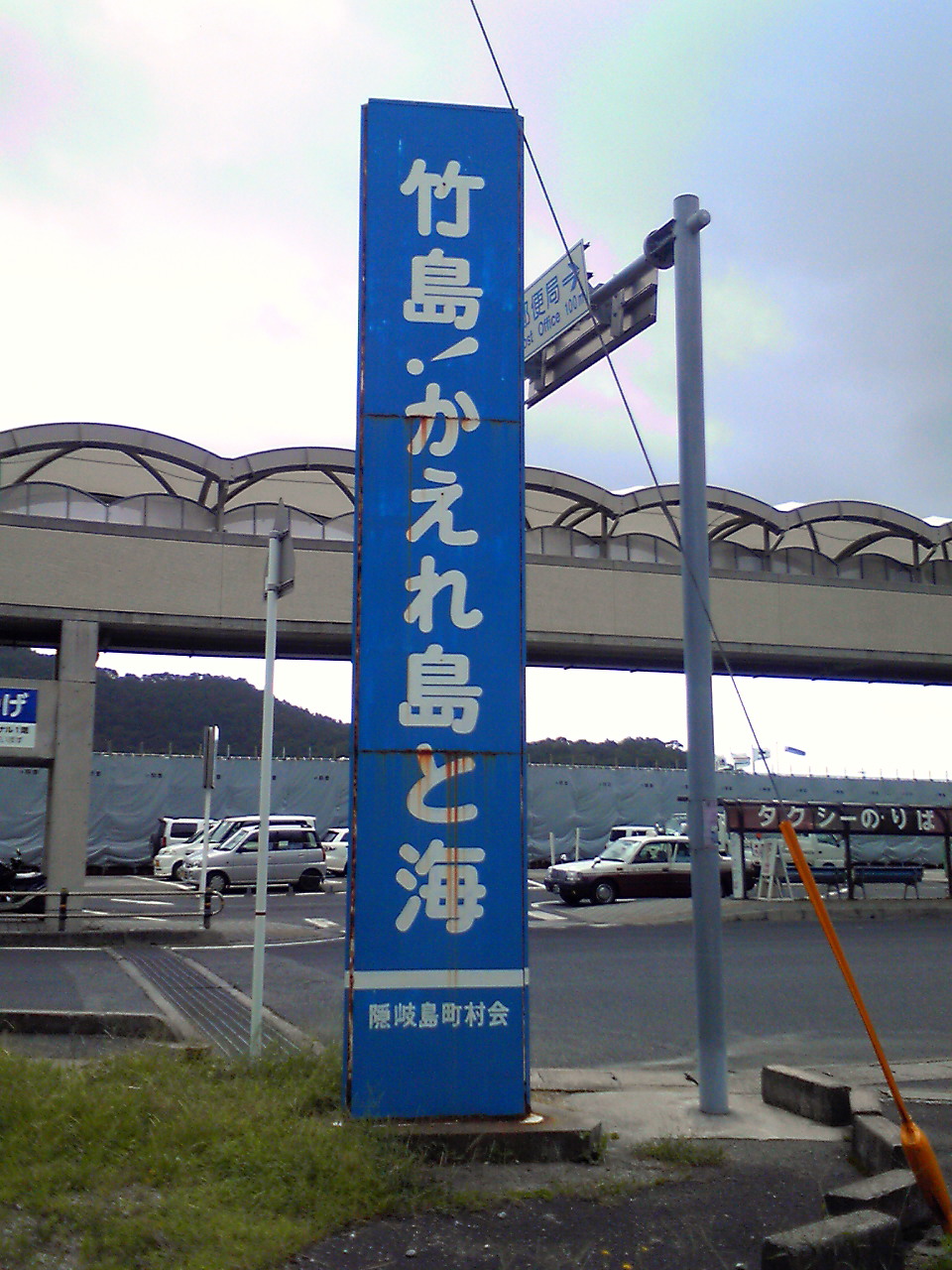 竹島は日本の固有の領土であり、「島根県隠岐郡隠岐の島町竹島官有無番地」という住所も存在するところであるものの、実効支配が及んでいないこともあって、こういうものが…。この看板の他に、そういったノボリがあちらこちらで見ることができます。やはり竹島がいちばん近いだけに、こういう運動はいちばん活発なようです。