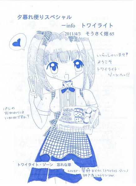今回は、2週間前にコスカで新刊を発行していたし、4月始まりのスクールカレンダー仕様になっているので、新たな本を発行せずに、このような、6pのペーパーを発行しました。僕の中では、最近のお気に入りの、神戸屋レストランの青い制服のまどちん! 前回のコスカでは魔法少女にもなった、まどちんですが、トワイライトのヒロインの中では、最近の一番人気!