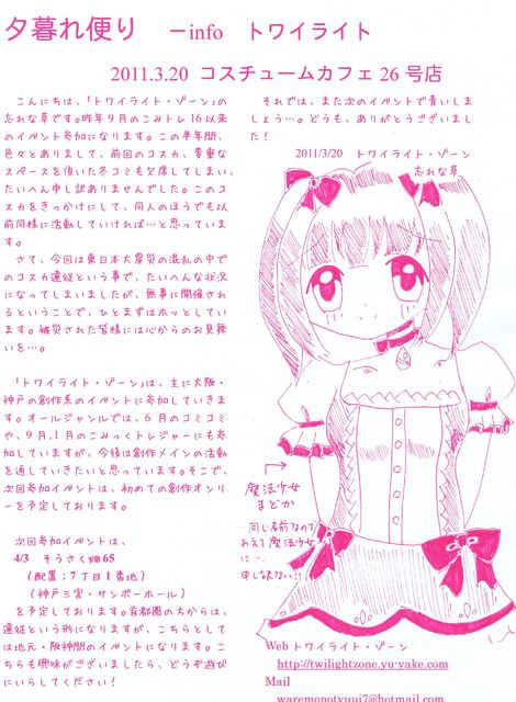 3月20日のコスチュームカフェですが、いつもの浜松町の都立産業貿易センターではなく、日本橋の綿商会館で行われます。震災による混乱の中で開催されるイベントということで、欠席されるサークルさんも多いと思います。絶対数も少ない、小さな規模になってしまったイベントですが、できる限りのことは行いたいと思います。