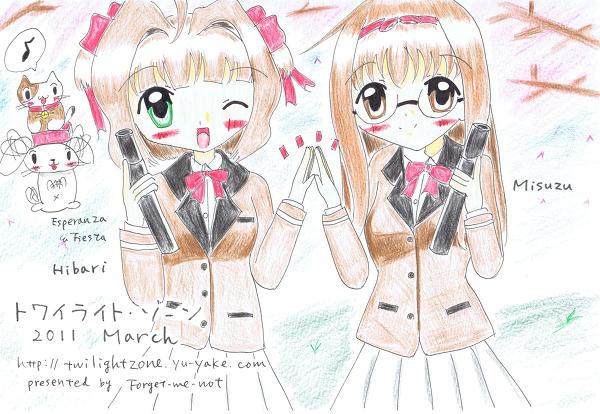 3月のTOP絵用に描き下ろしました。いつもなら、3月のTOP絵には、3月生まれのやよいちゃんの登場になるところですが、今回は高校生シスターズの最後の高校生2人、みすずちん&ひばりんが卒業ということで、今月は3月のTOPに起用してみました。これまで、このシリーズ、2008年から続いてきましたが、ついに、高校生ヒロインが、トワイライト・ゾーンからはいなくなってしまうので、きっとこういうシーンのイラストは今年が最後かもしれません。