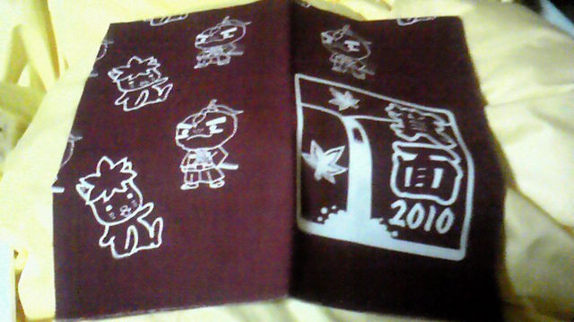 このような、箕面の北部、止々呂美(とどろみ)産の柚子だけを用いて作られた、柚子ドリンク「たきのみちゆずる」(150円)であったり、今年完成したばかりの、「キャラクター手ぬぐい」(600円)には、紺とエンジの2色があるのですが、全面に、モミジーヌとゆずるがプリントされた手ぬぐいがありました。密かに、グッズにもなりつつある、箕面のマスコット...。