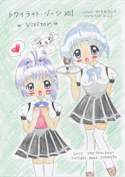 今回の新刊「トワイライト・ゾーンXIII -Visitor-」。表紙は、さつきさんと、G's合同誌でお披露目になった新ヒロイン、寺畑小花ちゃんの二人に登場していただいています。トワイライト・ゾーンではたびたび登場している、さつきさんのお父様のお店「Visitors」の基本形のウェイトレス服になります。