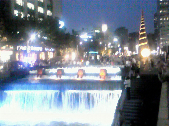 その川の最上流は、ソウル市役所附近に達していて、夜になるとこのように、ライトアップが施され、ものすごくファンタスティックな雰囲気になります。この日が金曜日の夜だったこともあって、多くの人がライトアップされた川で憩いを楽しんでいたのを見かけました。なかなか幻想的なスポットともいえると思います。