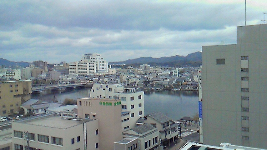 こちらは、松江の街中。ホテルの最上階の部屋だったので、窓から見える、松江の街並みを。奥に見えるのは、大橋川。中海と宍道湖を繋ぐ、汽水の川です。同じ山陰なのに、鳥取よりも遥かに都会です。