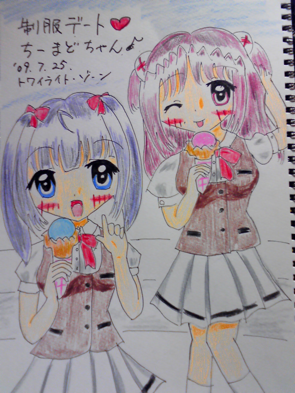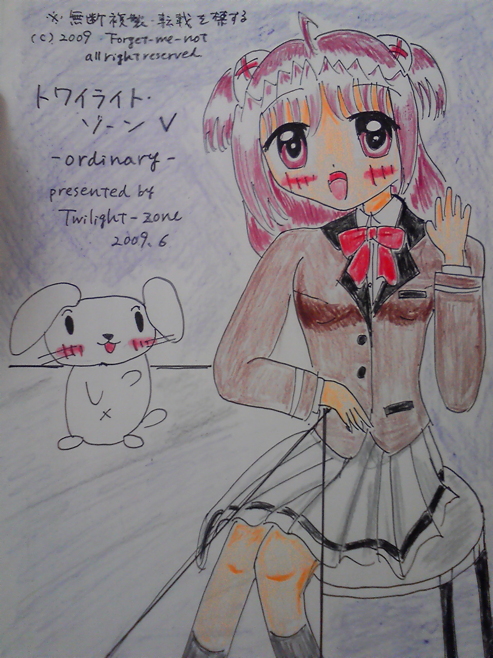 土曜日に移行して、2回目の「トワイライト・テール」の記事。今週のお話は、ちーちゃんとエスペくんのお話です。本来は「トワイライト・ゾーンⅤ」の裏表紙に描いたものですが、ちーちゃんの制服姿をカラーで描きたかったので、今回の裏表紙に採用しました。