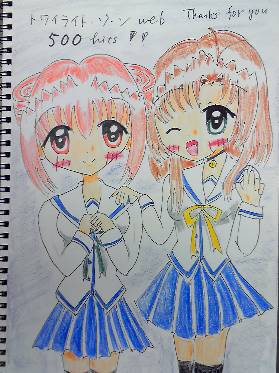 土曜日の「トワイライト・テール」の記事です。今週は、当サイト「トワイライト・ゾーン」のほうで、ちょうど500hitsを達成しまして、その記念絵もこめて、ピリオドリクエストも兼ねて、イラストを描きました。500hits記念のイラストは、エリーちゃんとやよいちゃんの姉妹の登場です。