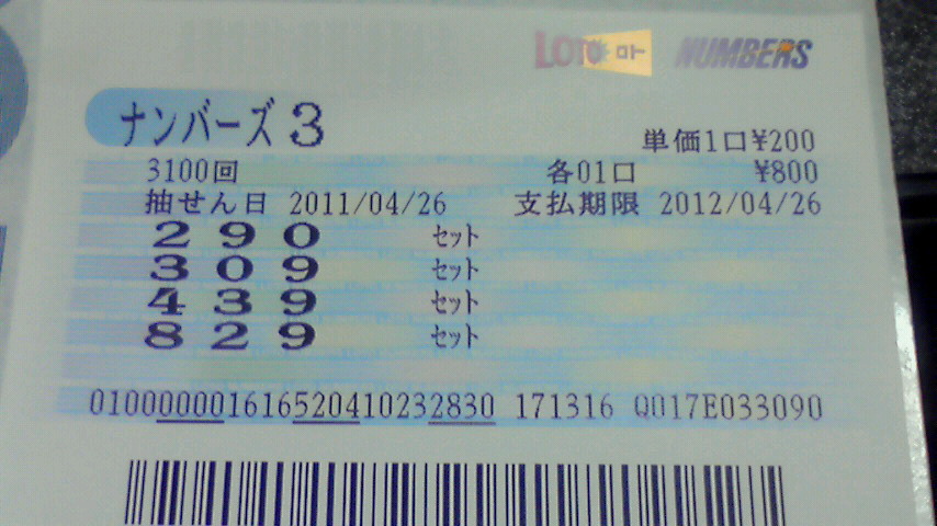 【当選】 第3100回 ナンバーズ3 (2011/04/26)