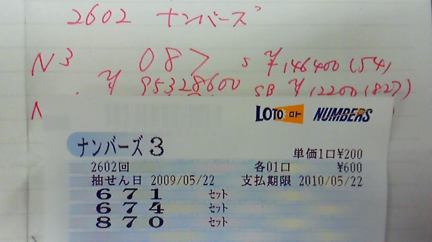 昨日抽選が行われた、「第2602回ナンバーズ3」で、ついに、158回ぶりの当選を射止めました!! 当選金額は、12,200円と、セットボックス当選にしては、なかなかの高配当で、非常にうれしいです! 久しぶりの当選であるの同時に、狙い通り確実に当てられたのは、本当にうれしかったです! この調子で次につなげたいですね!